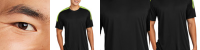 * 100% polyester wicking knit with color secure(r) technology that helps prevent dye migration * 90% polyester/10% spandex wicking mesh inserts with color secure(r) technology that helps prevent dye migration * Wicks moisture * Tag-free label * Low profile tapered collar * Raglan sleeves * Modified dropped back hem